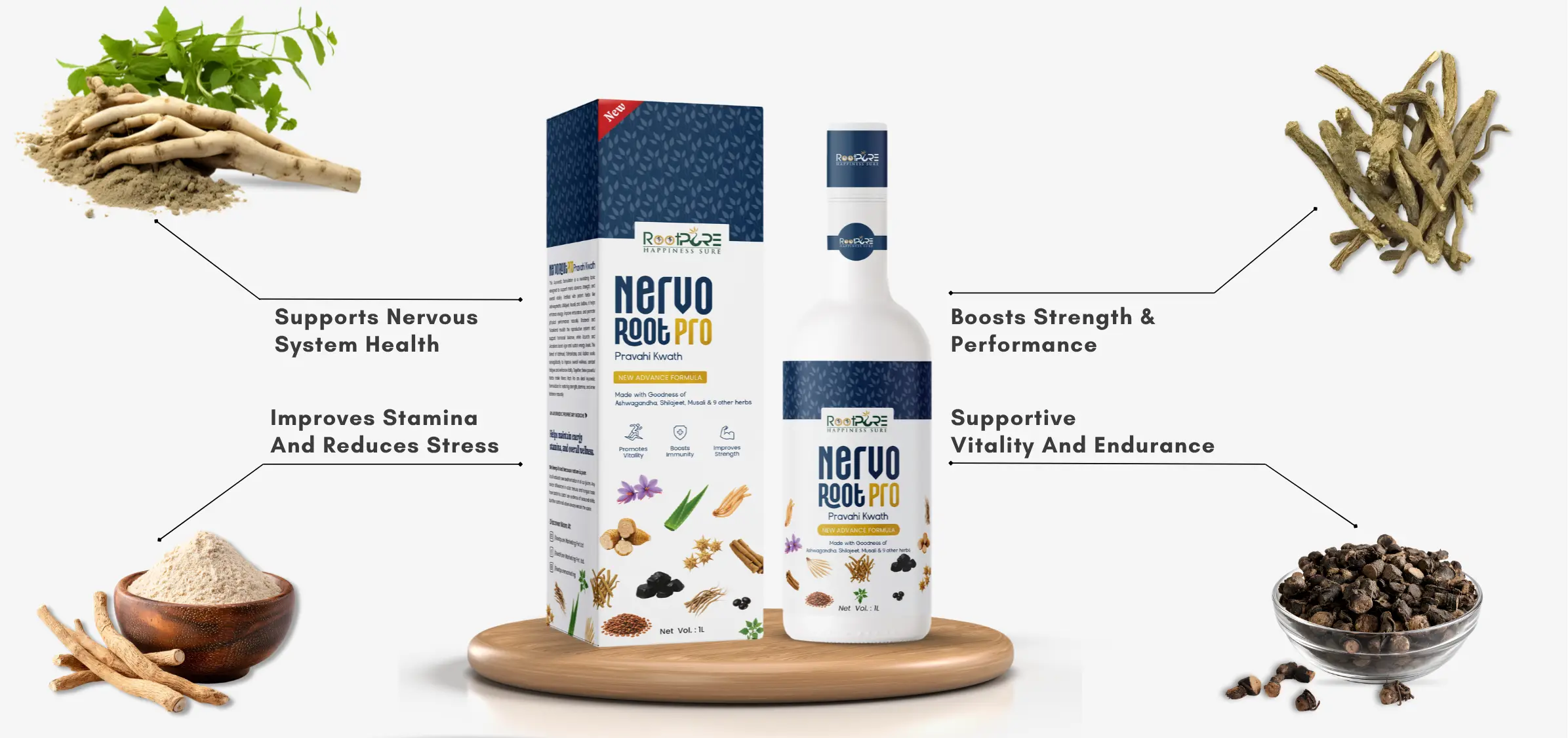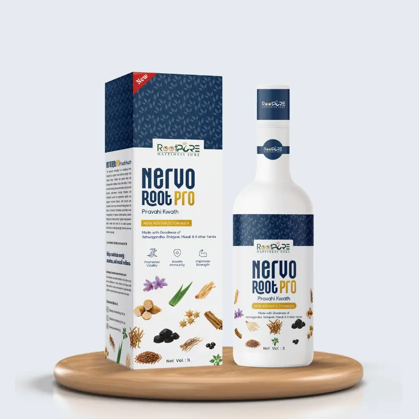 NERVO Root Pro Pravahi Kwath is an advanced Ayurvedic formulation that helps improve stamina, strength, and daily energy levels. Powered by time-tested herbs like Ashwagandha, Shilajit, Musali, Gokhru, and Shatavari, it supports natural vitality and enhances overall performance. This plant-based formula works at the root level to reduce fatigue, improve endurance, and promote a balanced, energized lifestyle—without harmful chemicals or side effects.