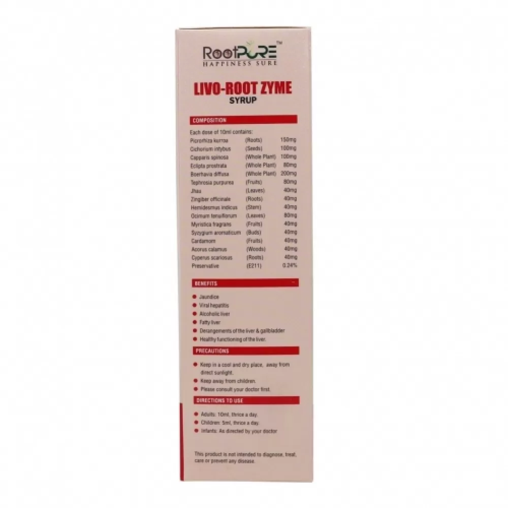 Livo Root Zyme is an Ayurvedic medicine that helps to restore liver functionality and keeps it healthy and protected. It is a highly effective ayurvedic formulation used in various types of liver disorders like jaundice, infective hepatitis, alcoholic-related liver problems, and digestion-related issues. This medicine exhibits hepatoprotective properties and restores the functional efficiency of the liver by protecting the hepatic parenchyma and promoting cellular regeneration. It ensures protection from alcohol-induced hepatic damage reduces the lipotropic effect in severe alcoholism and helps prevent fatty infiltration of the liver.