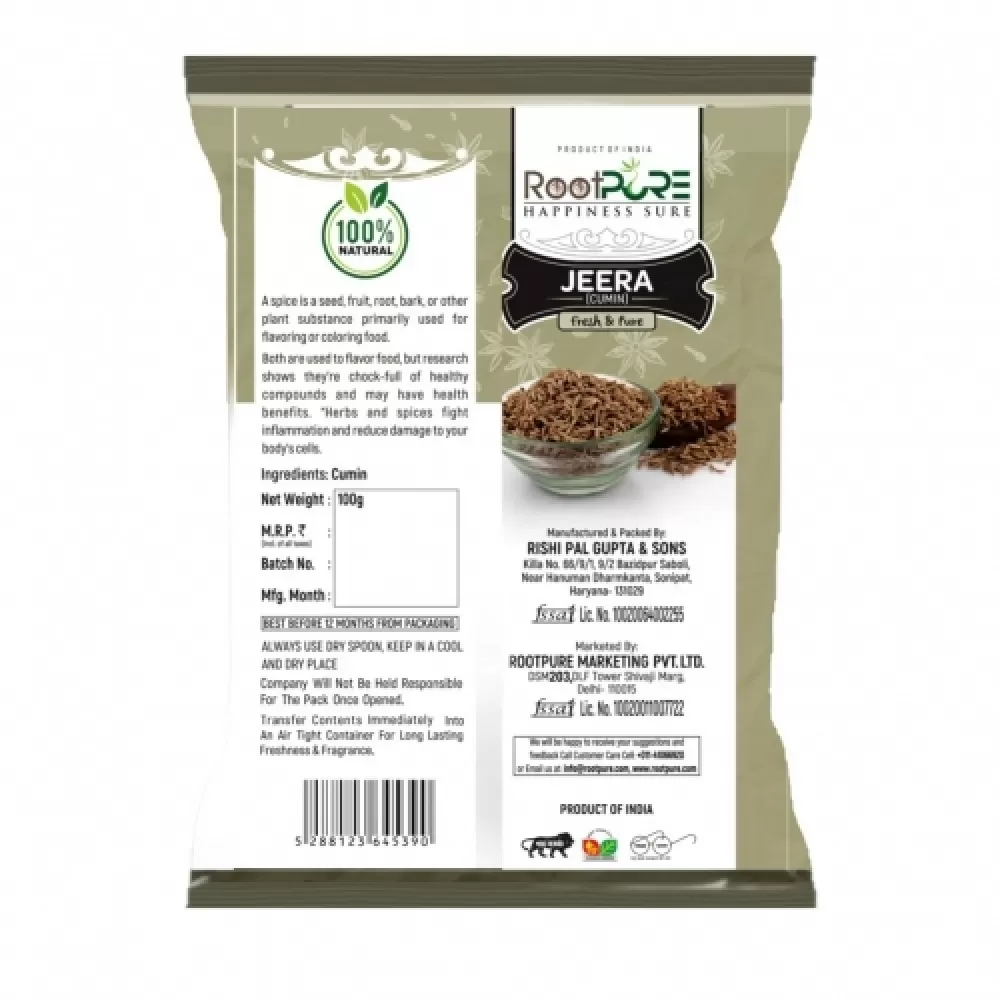 - Whole Cumin Seed Mastery: RootPure Jeera Whole is the embodiment of whole cumin seeds, capturing the essence and purity of this versatile spice.